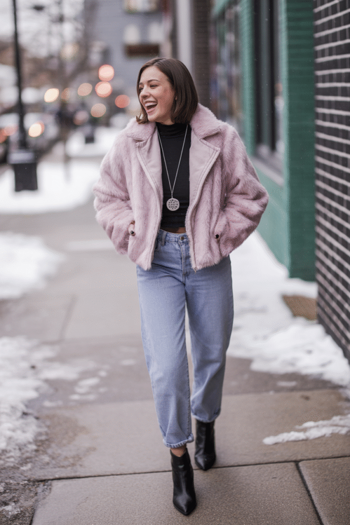 4) Faux-Fur Jacket + Straight Jeans + Pointed Boots