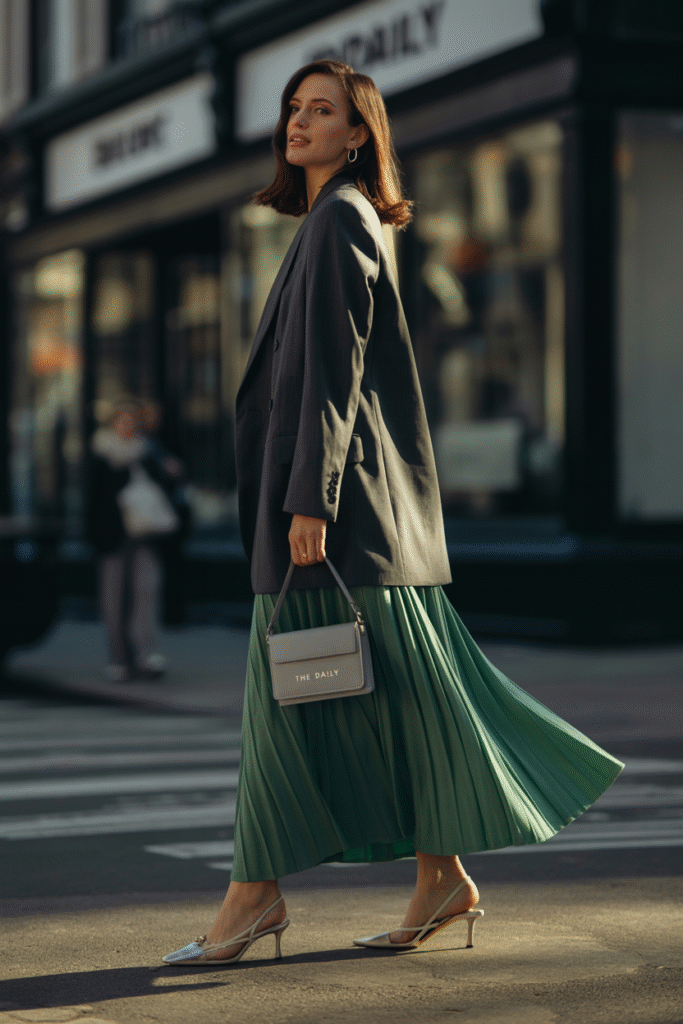 - 0–5 °C: Thermal top + longline blazer + lined maxi skirt + tights + kitten-heel boots.