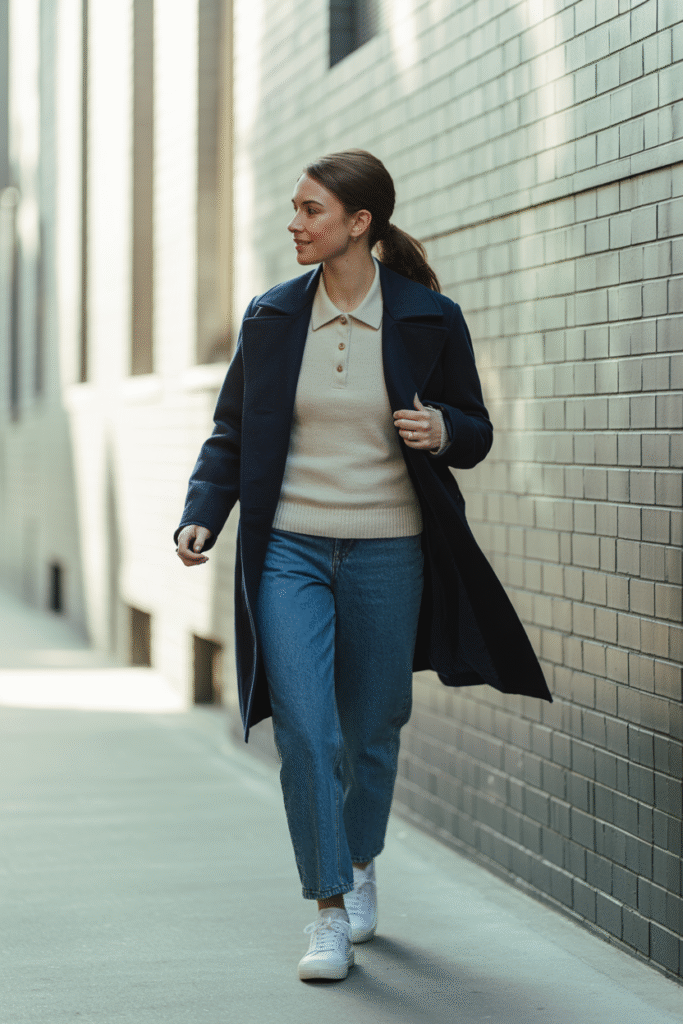 10) Knit Polo + Straight Jeans + Pea Coat + Sneakers