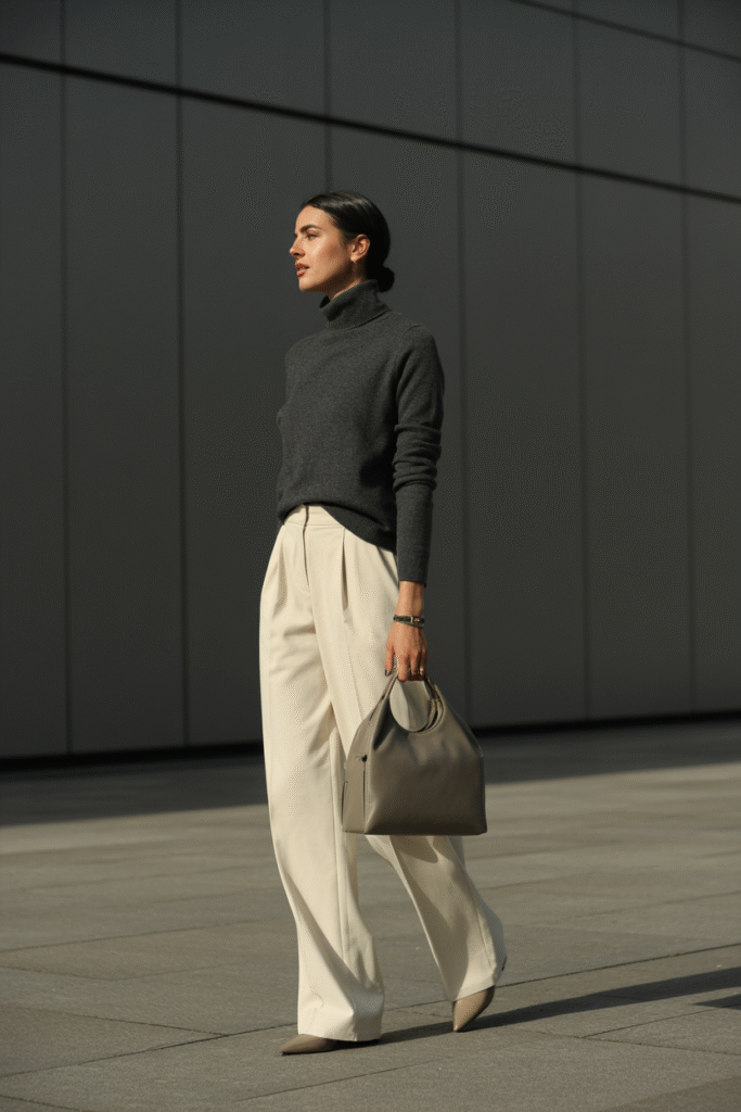 3) Cashmere Turtleneck + Wide-Leg Trousers + Structured Bag