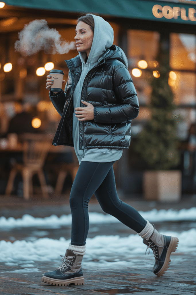 7) Puffer (Sleek) + Hoodie + Leggings + Lug-Sole Boots