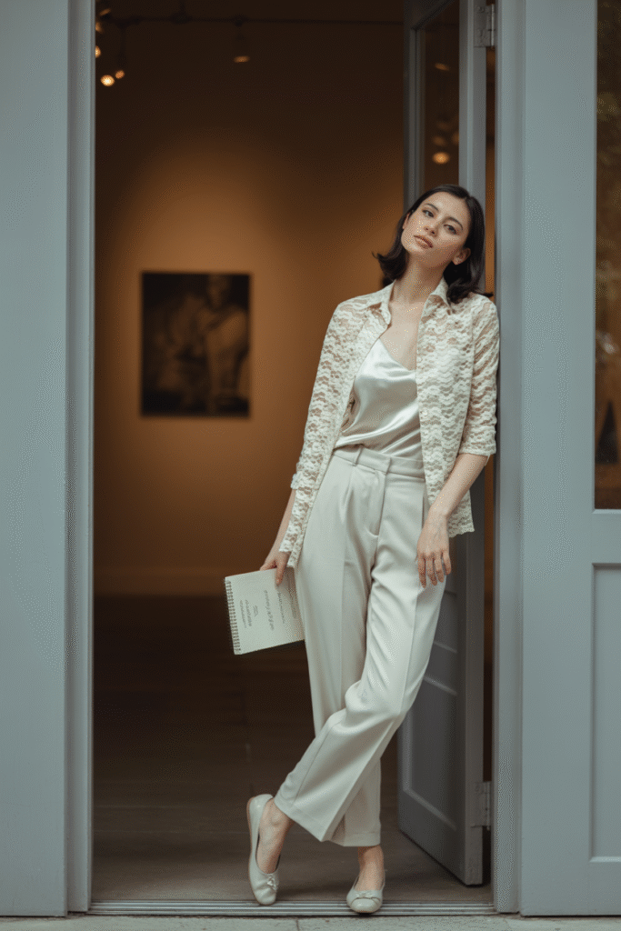 9) Lace Blouse + Tailored Trousers + Ballet Flats