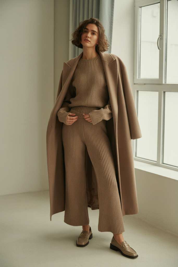 5) Monochrome Knit Set + Long Wool Coat + Loafers/Boots