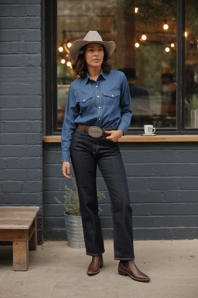8) Denim Shirt + Dark Jeans + Belt + Chelsea/Western Boots