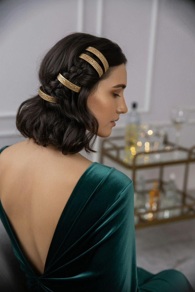 I save this for dressy dinners when I want my neckline to shine. A low braided chignon with metal cuffs looks boutique-blowout fancy without the salon price.