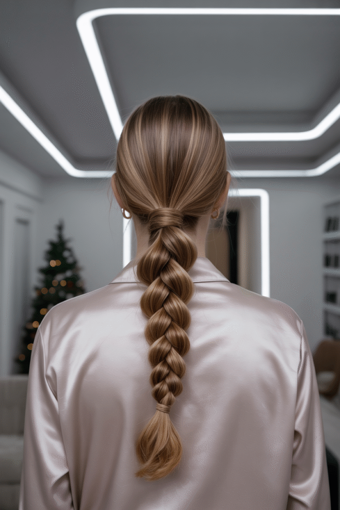I call this one my “meeting the in-laws but still fun” style. A rope braid pony looks sleek and intentional, and it handles coats and scarves without unraveling.