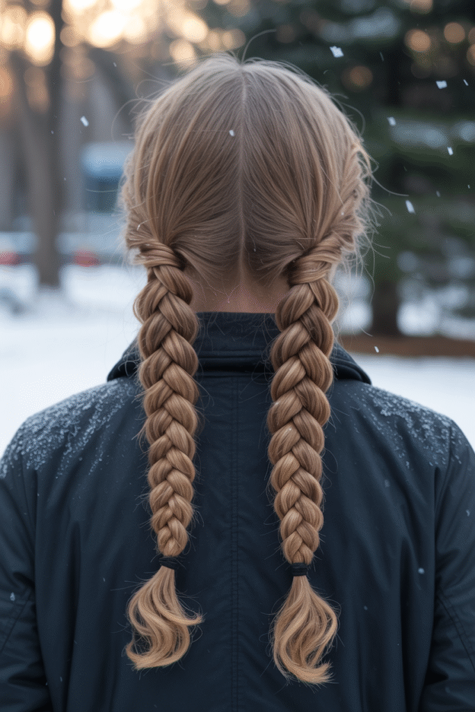 You remember school-day pigtails. Let’s upgrade them. I Dutch braid each side, then I connect both tails into one low braid or leave them as twin ropes for a sporty-chic look.