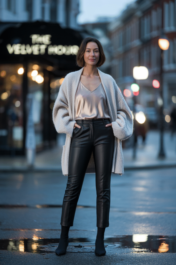 8) Oversized Cardigan Coat + Silk Cami + Leather Trousers + Sock Boots