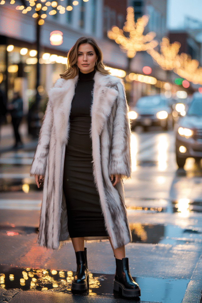 12) Faux-Fur Statement Coat + Turtleneck Dress + Platform Chelsea Boots