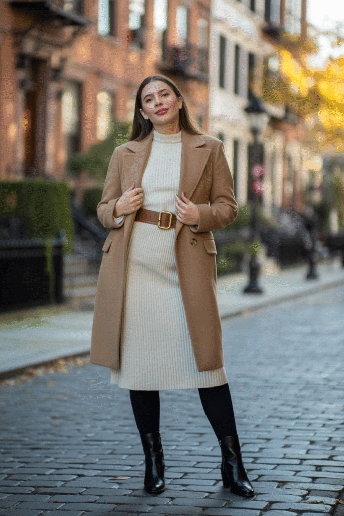 9) Double-Knit Dress + Belted Coat + Opaque Tights + Tall Boots