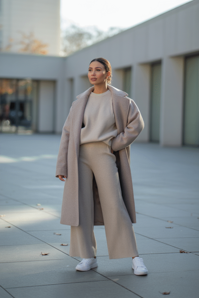 15) Monochrome Knit Co-Ord + Long Wool Coat + Minimal Sneakers