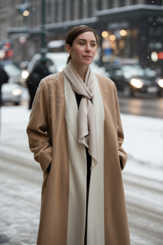- Why it works: Monochrome camel-and-cream feels intentionally luxurious. The drape of wide-leg pants keeps the silhouette elegant.