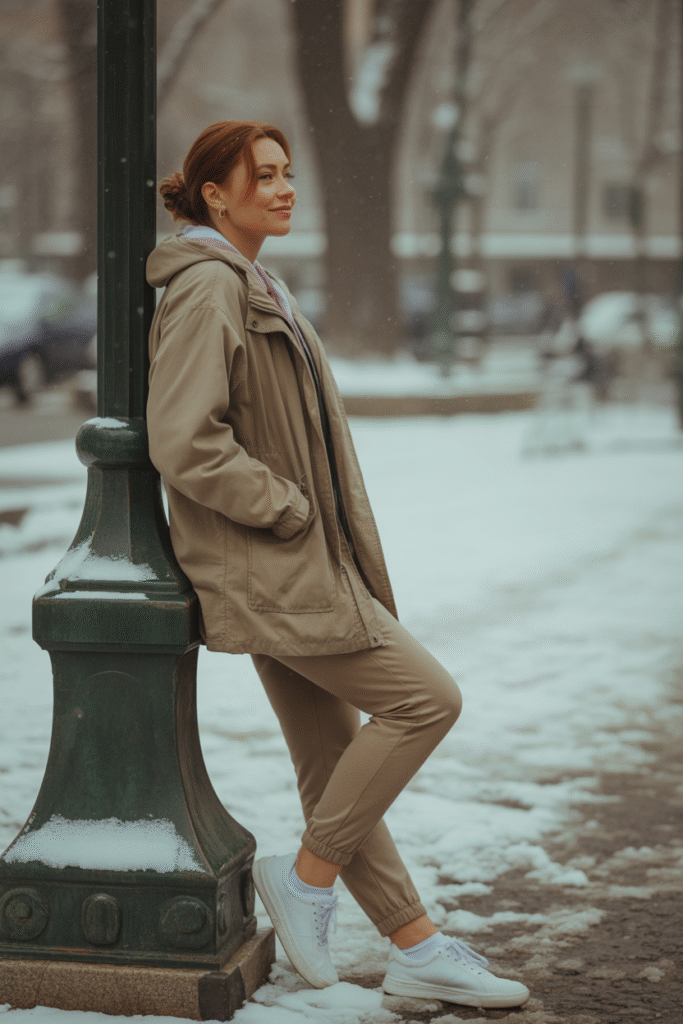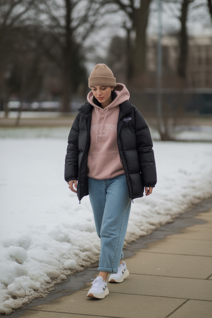 For casual weekends, toss a parka over joggers and a hoodie. Add sneakers or snow boots depending on the weather.