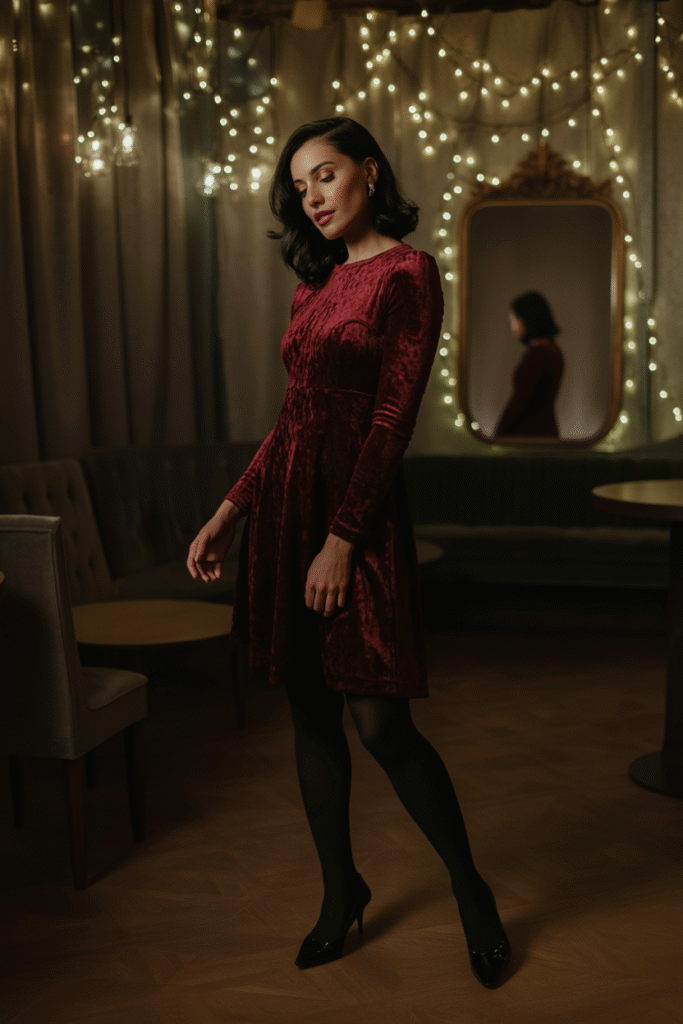 Perfect for a special night. A velvet dress feels festive and warm. Black tights and heels complete the look.