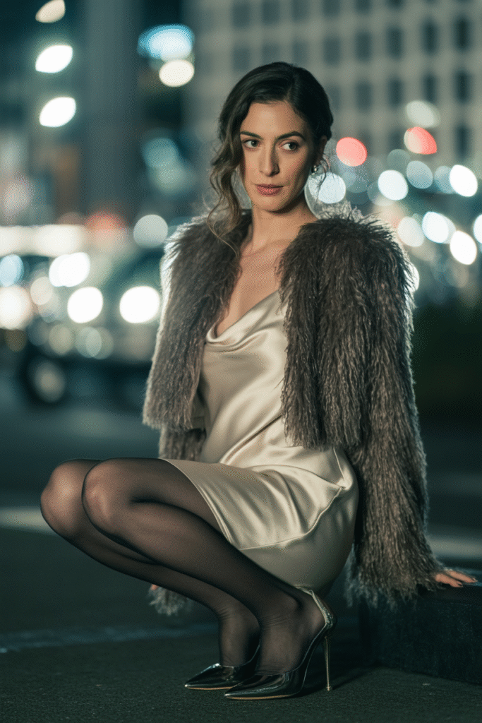 For a night out, layer a faux fur jacket over a slip dress. Add sheer tights and ankle boots to keep warm.