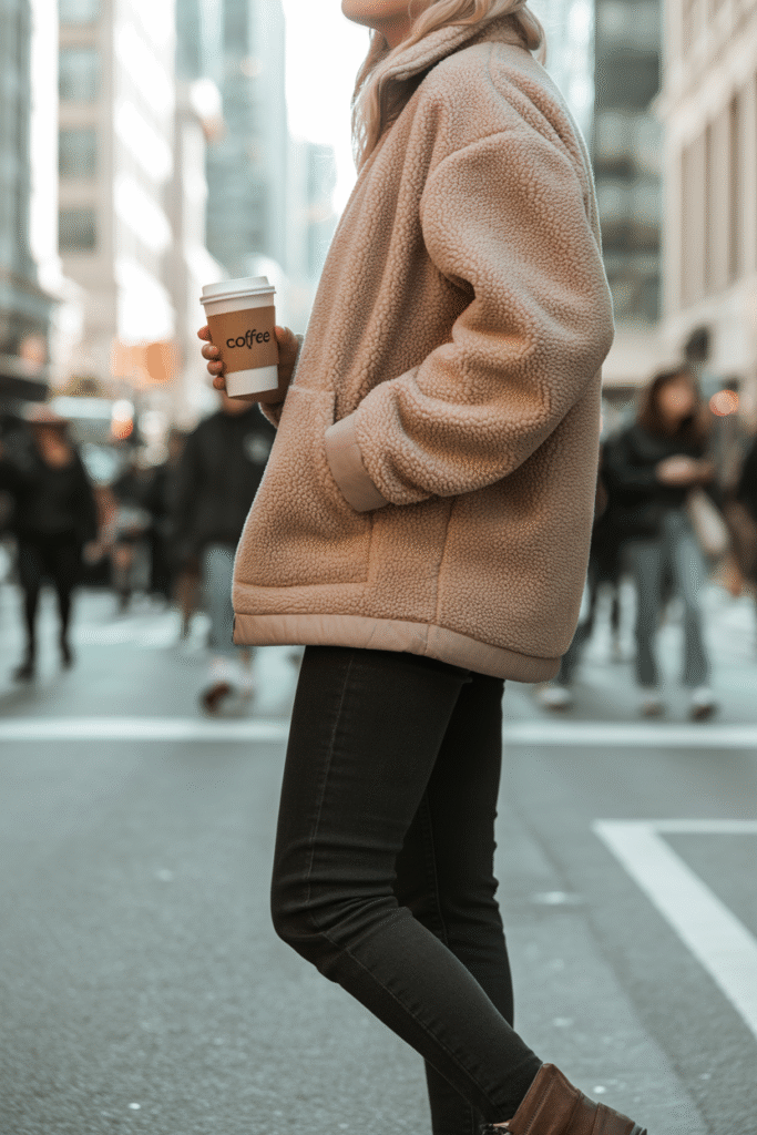 Sherpa makes everything feel like a hug. Pair it with sleek black jeans so the look doesn’t feel too bulky.