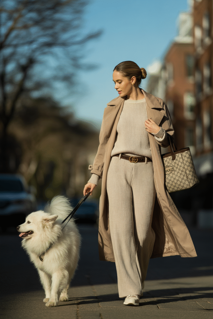 You know those knit lounge sets? Wear the top and pants together with sneakers and a trench coat for errands. You’ll feel comfy but still stylish.