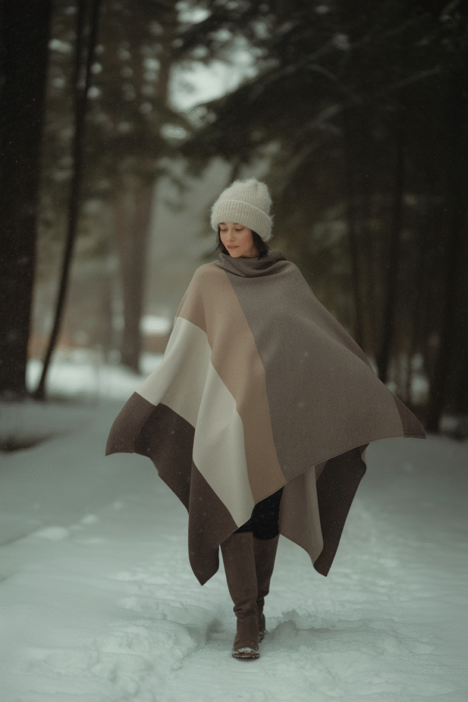 A poncho or cape is dramatic but cozy. Add leggings and tall boots underneath so it doesn’t feel too bulky.