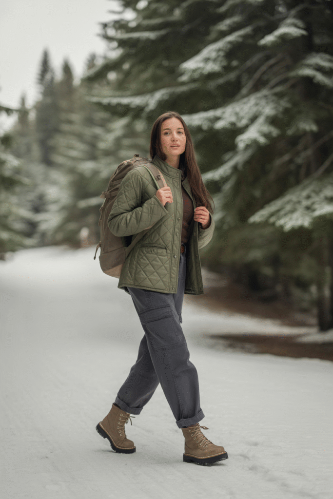 This one feels super practical for outdoor days. Toss on a quilted jacket, add cargo pants, and lace-up boots.