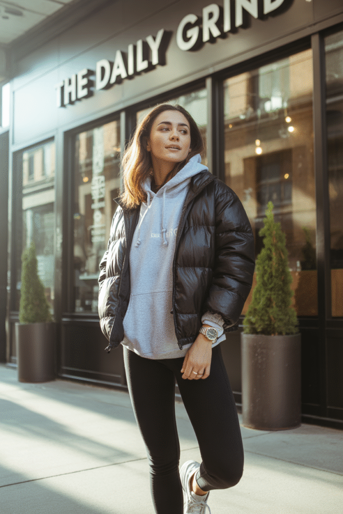 Perfect for errands. Toss on black leggings, a long hoodie, and a puffer jacket. Sneakers make it casual, but swap in combat boots if you want some edge.