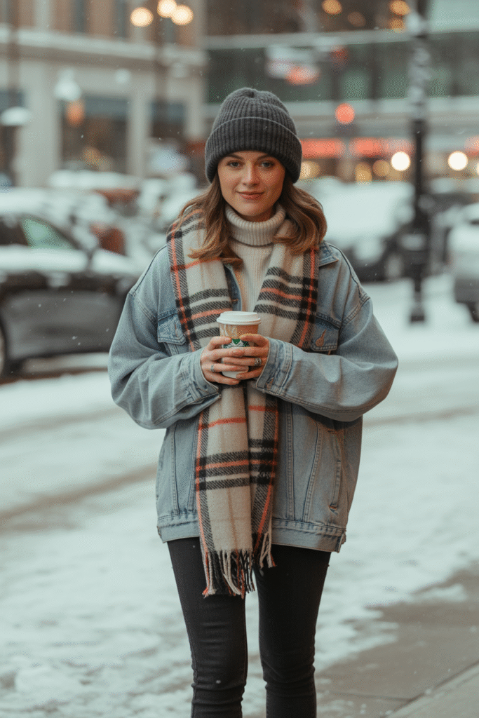 Layer a chunky scarf over your denim jacket, then wear with leggings or jeans. A super easy everyday look.