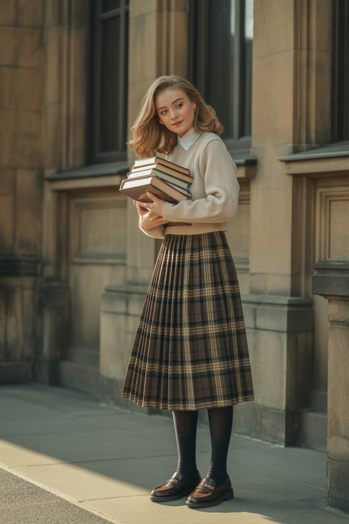 Channel cozy academia vibes. Add tights and loafers or boots. Pop on a beret if you’re feeling extra playful.