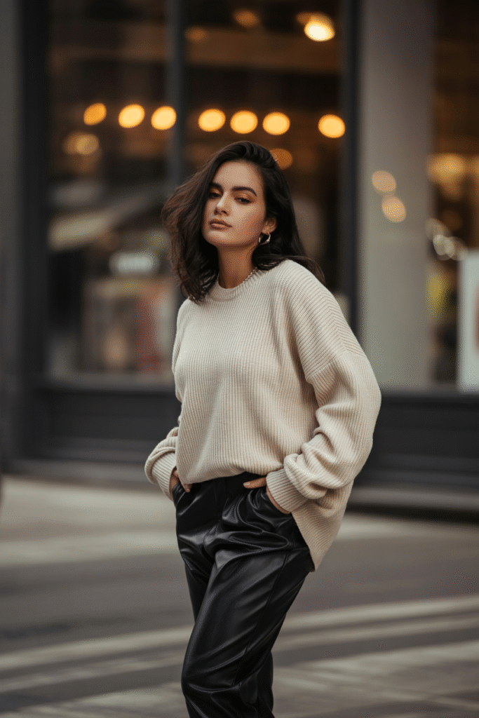 I love mixing soft with edgy. A slouchy knit on top balances out the sleekness of faux leather pants.