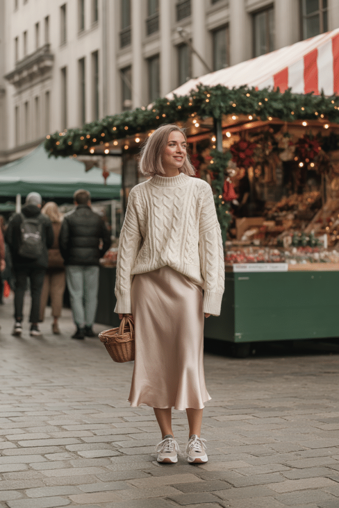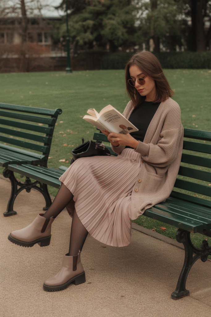 This one feels charming. A midi skirt with tights, layered under a slouchy cardigan, gives that cozy-chic vibe. Pair with loafers or ankle boots.