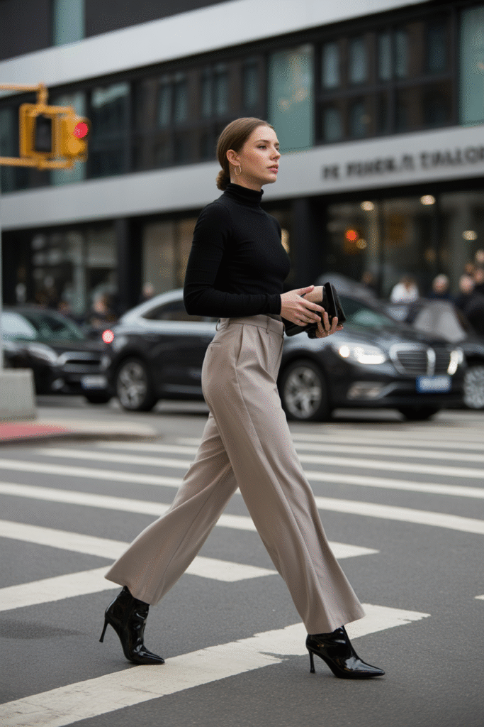 For days when you want to look polished. Tuck a slim turtleneck into wide-leg trousers, then add heeled boots. Super simple but very “effortlessly chic.”