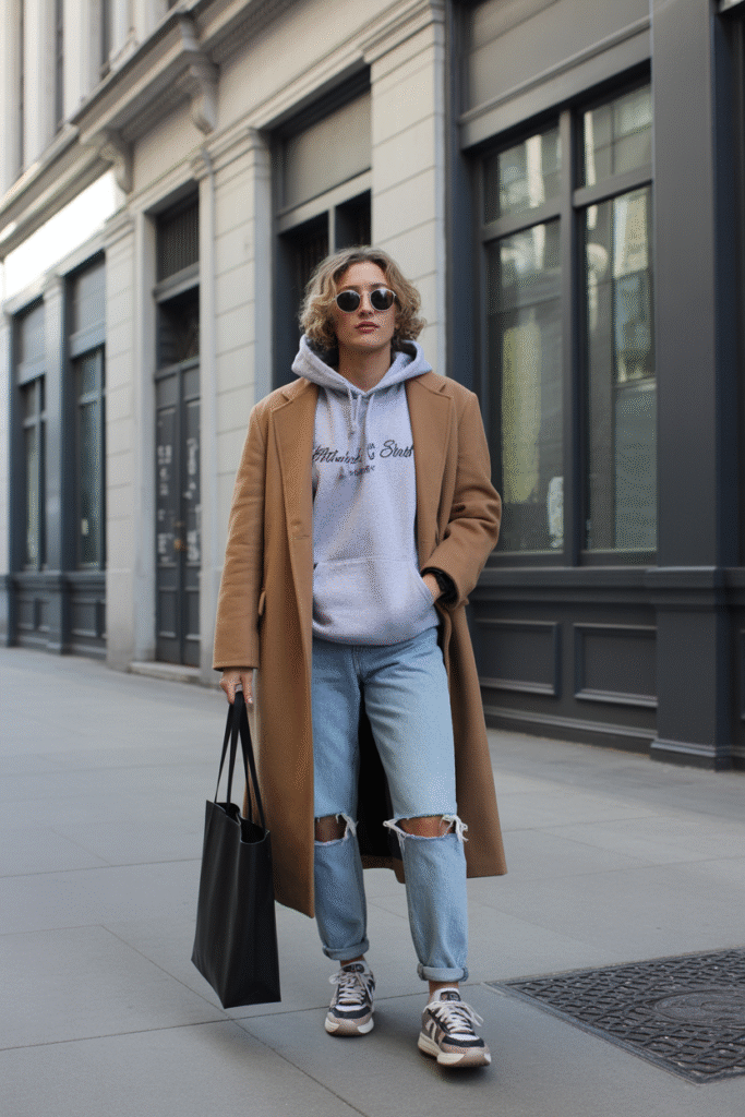 What I love about this is how it mixes casual and classy. Toss your favorite hoodie under a long wool coat. It feels cool without trying too hard.
