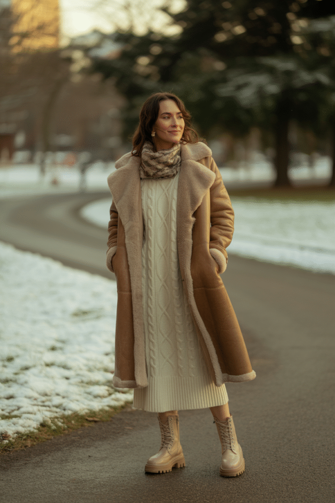 Why it works: Thick cable knits carry bulk. A shearling coat (real or faux) meets that visual weight so your coat doesn’t look flimsy next to the dress. The textures together read rich and wintry.