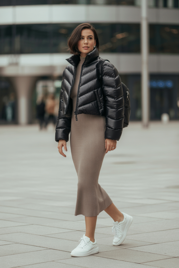 Why it works: A cropped puffer sits at the natural waist and instantly defines shape over a sleeveless or slim long-sleeve knit dress. The high-volume topper + lean base creates impactful proportion.