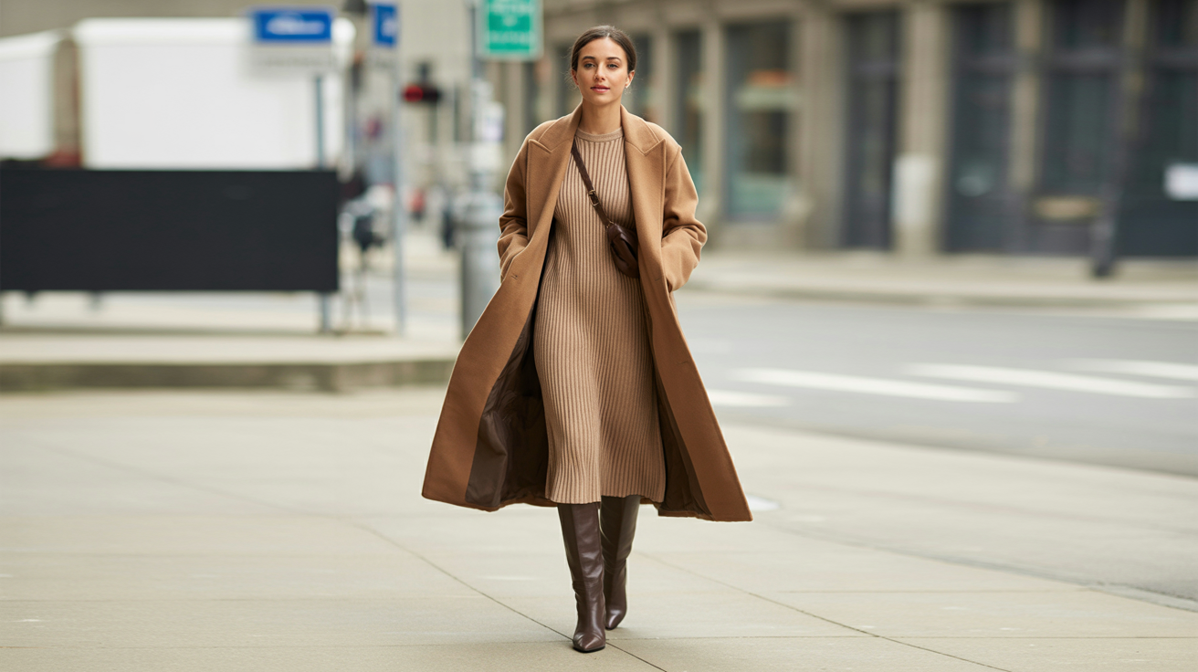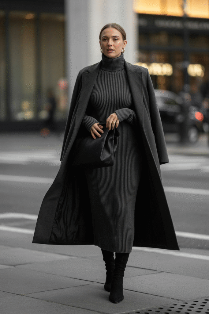 Why it works: A midi sweater dress in a single hue under a tailored wool coat creates one long, uninterrupted line. Monochrome visually lengthens; the wool coat adds structure so the knit doesn’t feel too casual.