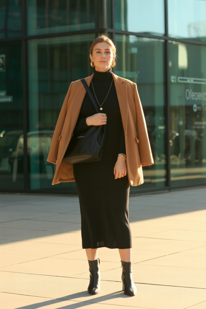 Why it works: A turtleneck column dress provides a clean line; an oversized blazer or coatigan (coat-cardigan hybrid) adds structure without stiffness. It’s the sweet spot between office and off-duty.