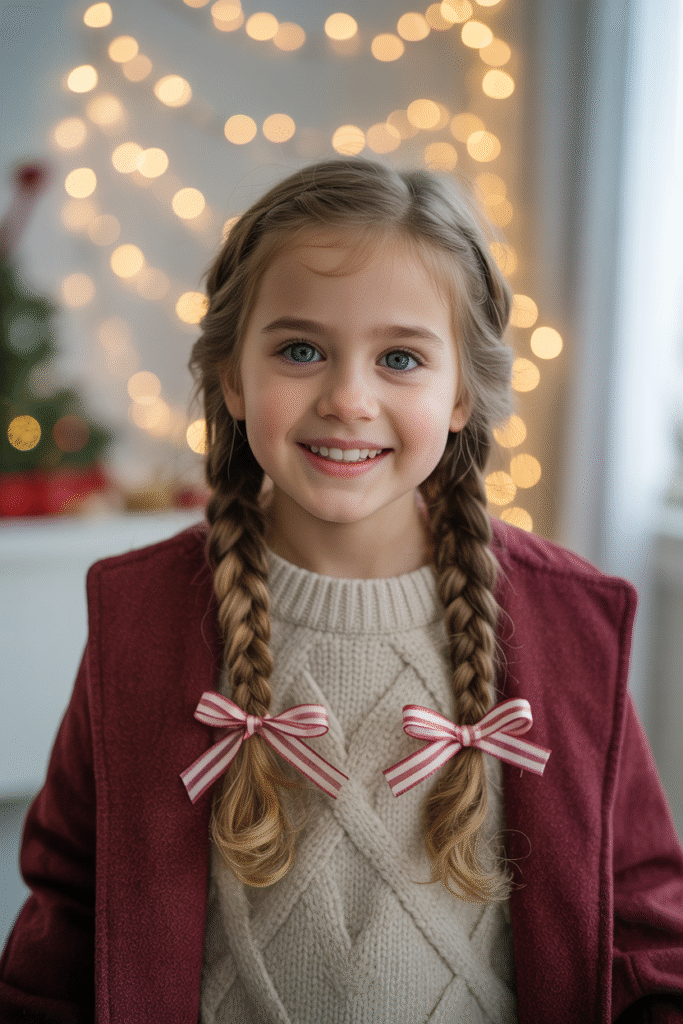 - S-shaped part feeding into two neat pigtail braids; ends curled under with soft ribbons.