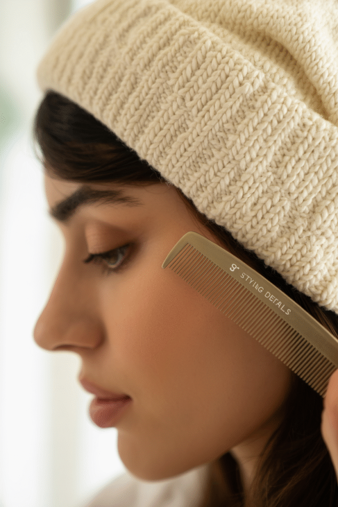 Wear the hat 1–2 cm behind the hairline, and use a slouchy or ribbed knit that allows space up top. A thin satin scarf under the hat helps distribute pressure evenly.