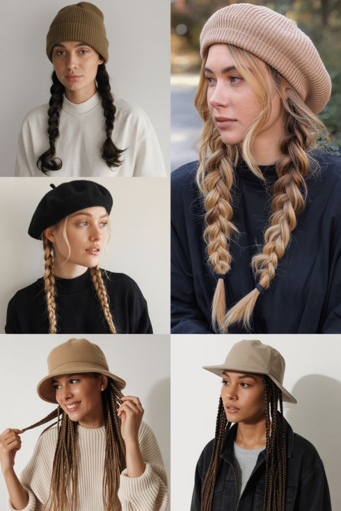- Bucket hats (winter versions): Cute with mid-height pigtail braids or shorter braids; brim frames the face.