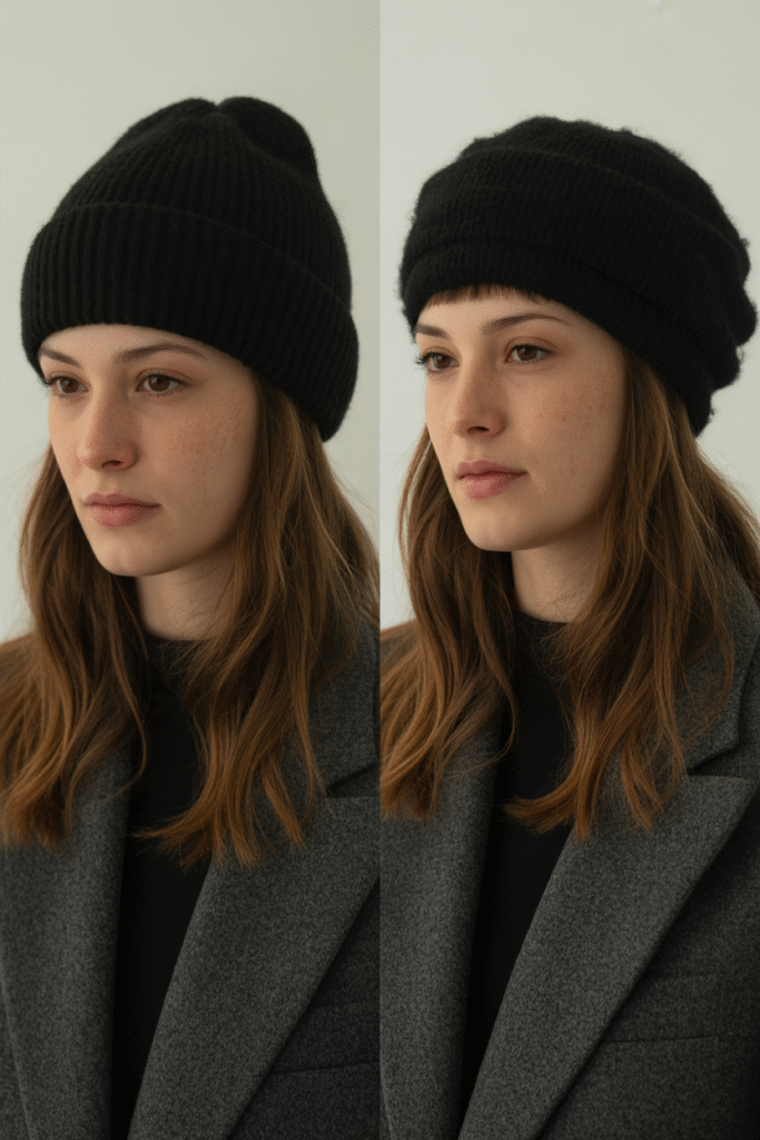 - A slightly higher beanie (small “puff” up top) balances longer faces. Adjust by pinching the back of the beanie when you pull it on.