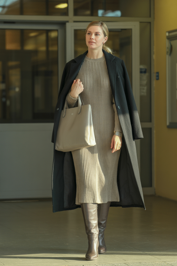 Formula: Sweater dress or knit set + knee-high boots or sleek Chelsea boots + long coat + structured tote.