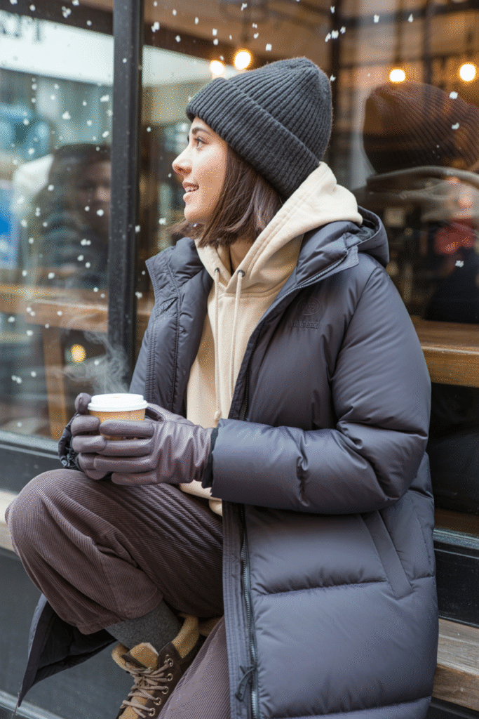 Formula: Down coat (no visible branding) + cashmere hoodie + cords or wool joggers + hiker-style boots + beanie.