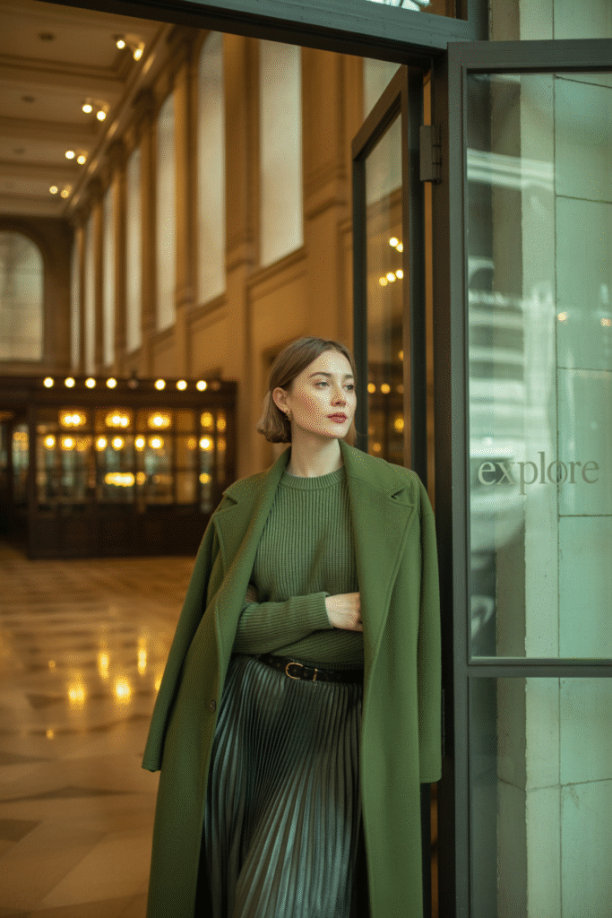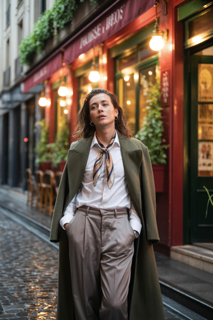 You skip a blazer because the coat plays that role. You tie the scarf loose and keep jewelry simple.