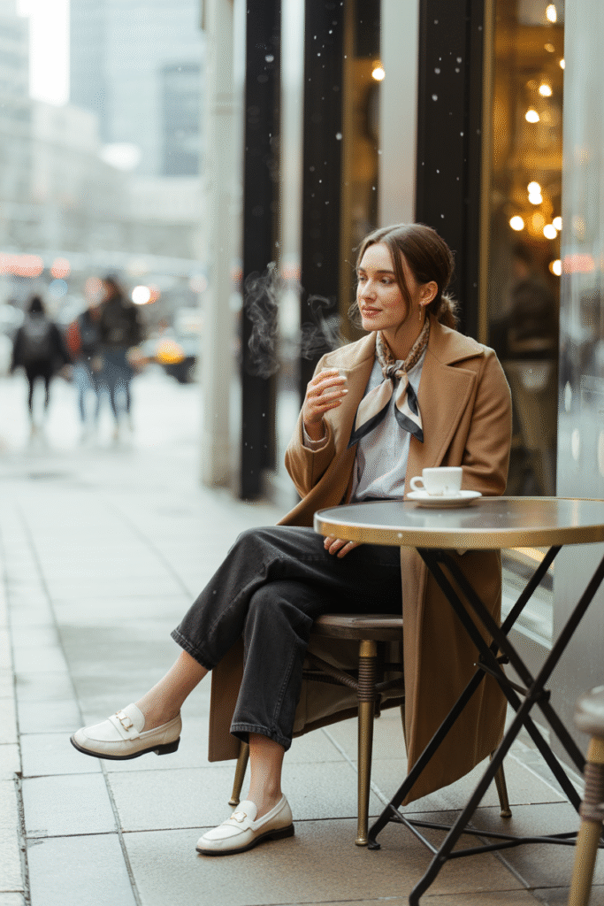 Pieces: jeans, shirt or ribbed long-sleeve, coat open, sneakers/loafers, silky scarf.