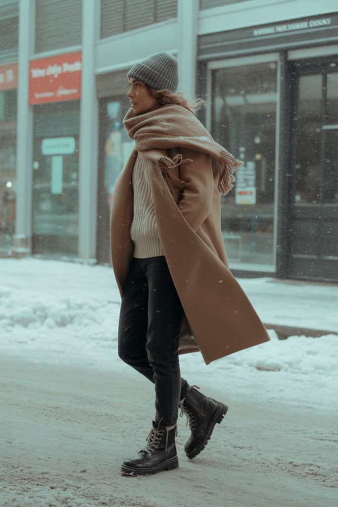 - Coat: mid-length wool or insulated coat with pockets