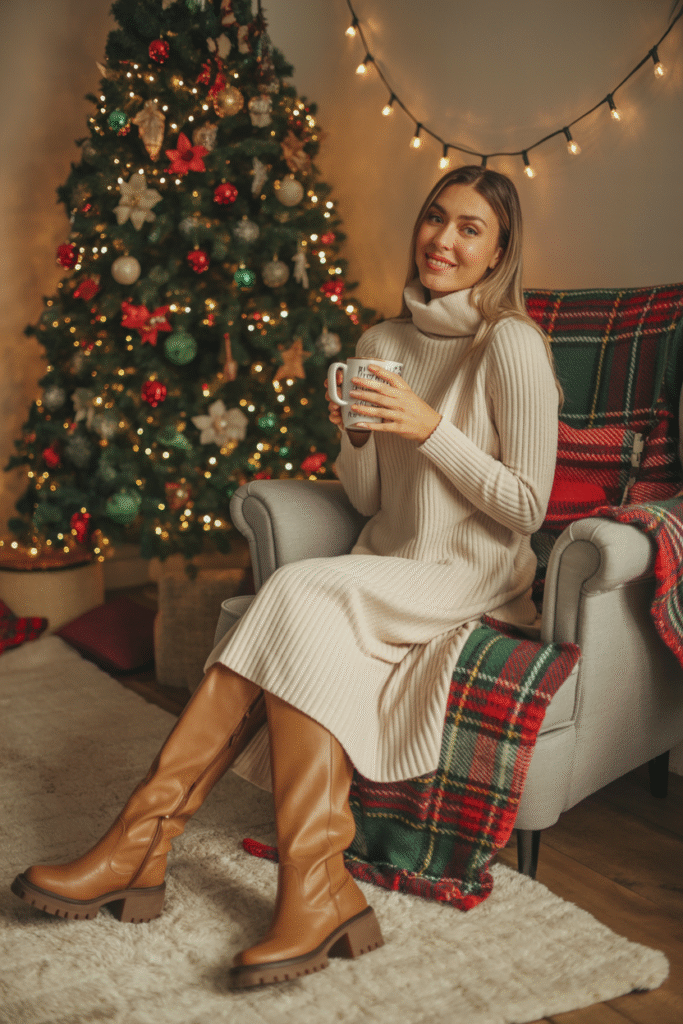 - A knit midi dress with knee-high boots (warm, flattering, and zero effort).