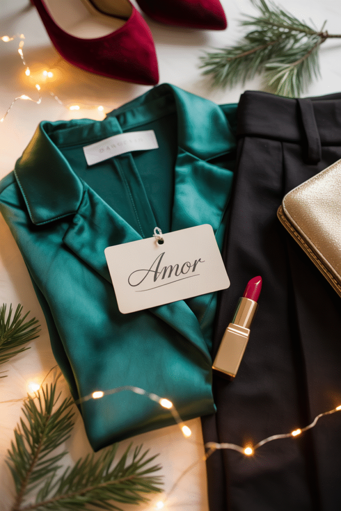 - Try a silky emerald blouse with tailored black trousers for a chic but subtle nod to tradition.