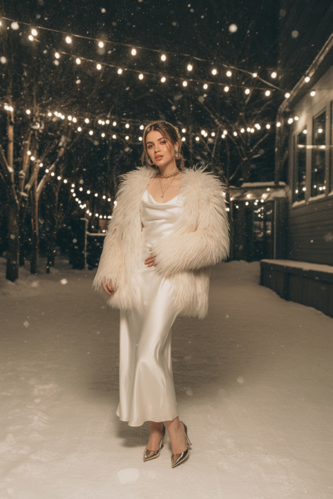 - Ivory slip dress topped with a fluffy faux-fur coat.
